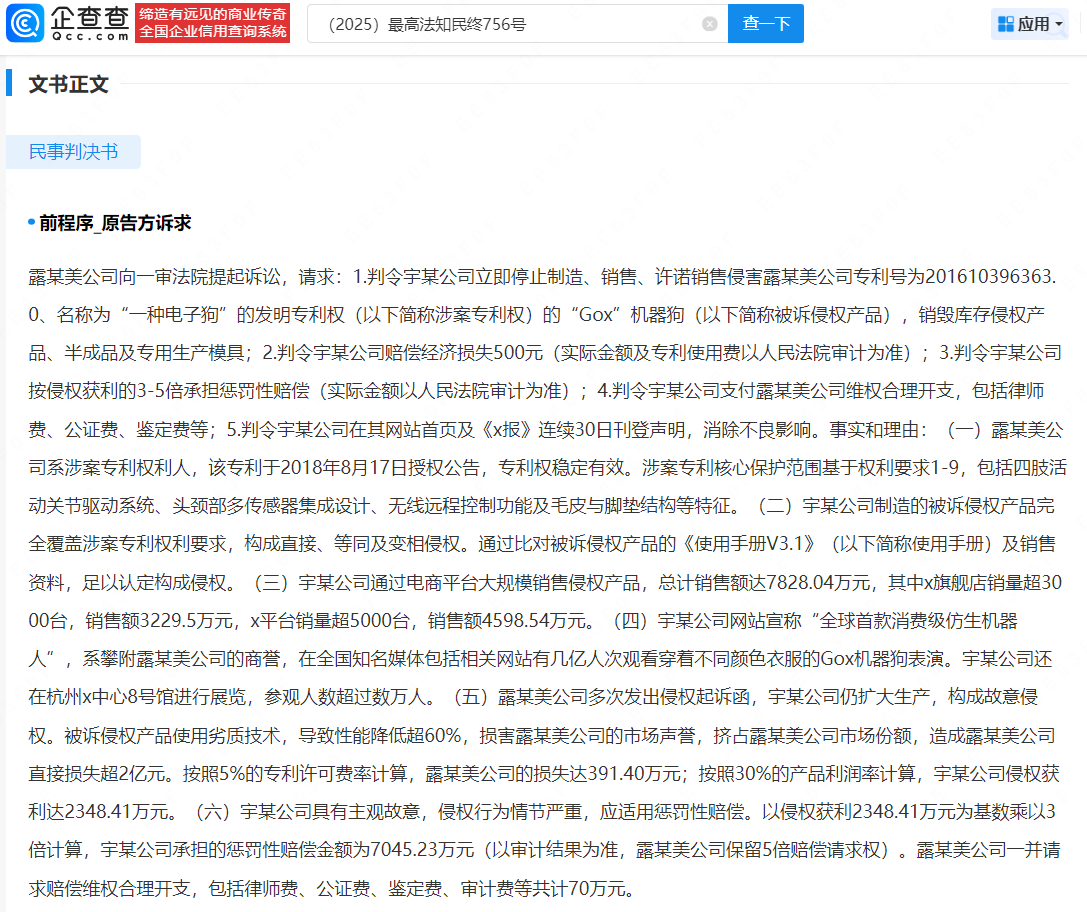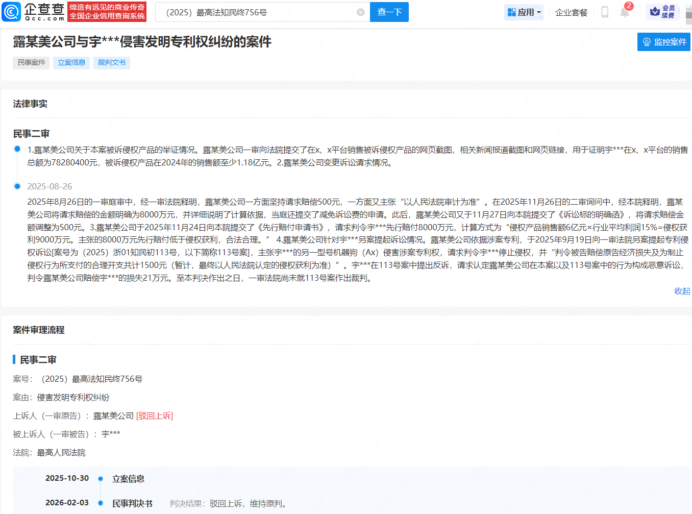 近日,露韦美起诉宇树科技侵害发明专利权纠纷二审宣判,最高人民法院驳回原告露韦美公司全部诉讼请求,维持了一审判决中认定的宇树科技的被诉产品不落入涉案专利保护范围,因此不构成侵权。案件流程信息显示,去年7月,杭州露韦美日化有限公司起诉杭州宇树科技股份有限公司侵害发明专利权,起诉状中声称宇树公司侵权获利高达数千万元,该案于去年8月在杭州中院开庭审理。9月26日,杭州中院对该案作出一审判决,驳回原告的全部诉讼请求。原告不服提起上诉,法院二审维持原判,并指出露韦美公司在一审已经认定宇树公司不构成侵权、其诉讼请求被判决驳回的情况下,请求法院先行判决宇树公司赔偿8000万元,并以此作为赔偿诉讼请求数额,但二审询问结束后仅一天又以书面方式确定为500元,前述行为精心算计、反复无常,意在规避高额诉讼费并向对方施压,其诉讼行为违背诚信原则,依法予以谴责。