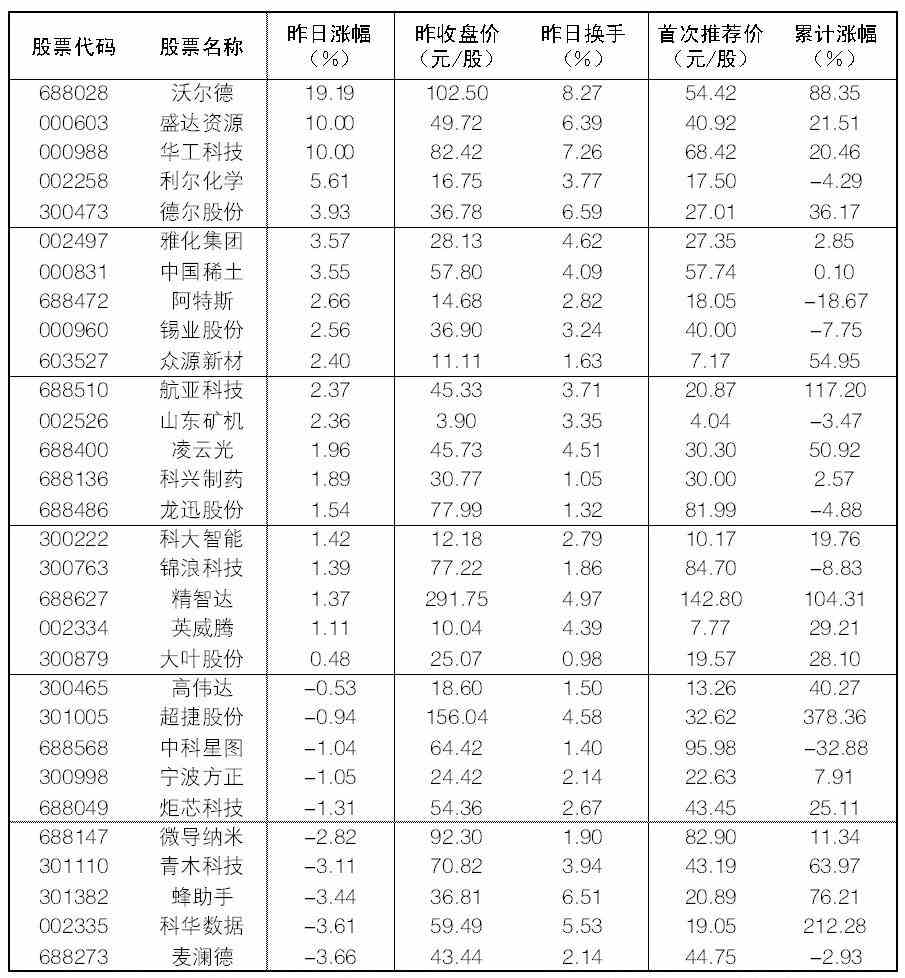 大众30指数成份股中,24日涨幅前五位的分别是沃尔德、盛达资源、华工科技、利尔化学、德尔股份,涨幅分别为19.19%、10.00%、10.00%、5.61%、3.93%;跌幅榜上,麦澜德、科华数据等跌幅居前。
